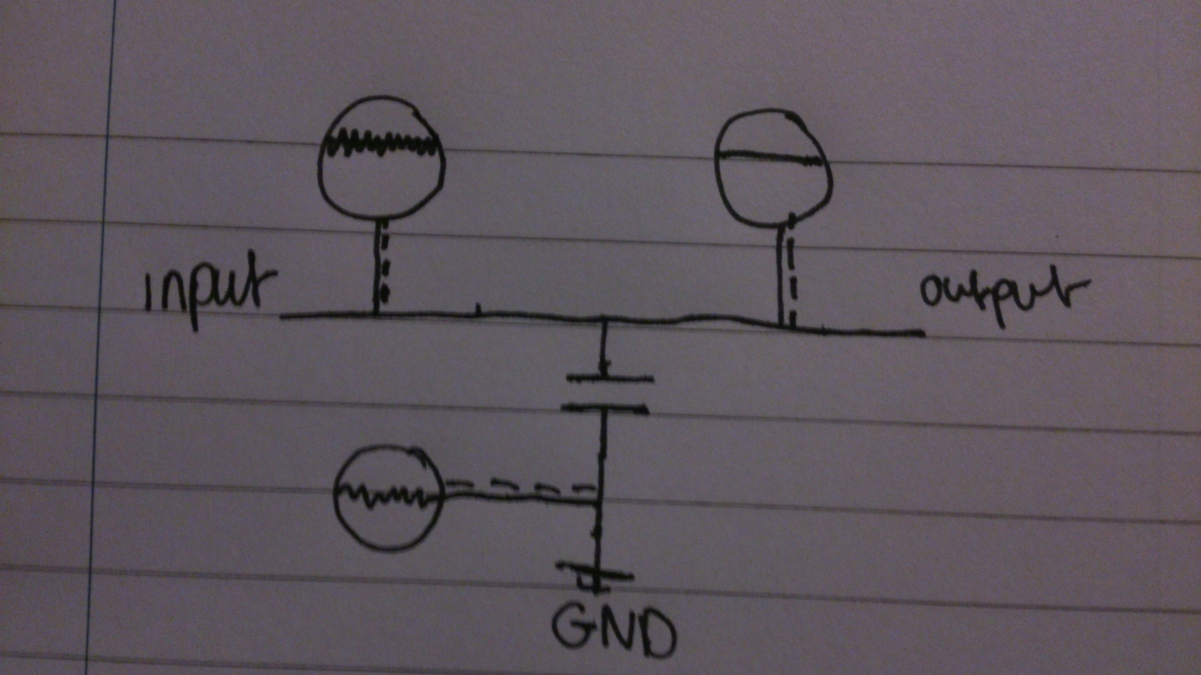 Capacitors block DC whilst allowing AC through. If there is noise present on a DC voltage, a capacitor can link the circuit directly to ground. The effect of this is that any noise (as AC) will filter down through the capacitor to ground, whilst DC will pass though the rest of the circuit as though the capacitor wasn’t there. When used in this way it is known as a decoupling capacitor.