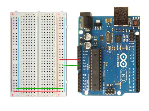 Once you have done this, connect the Arduino to the breadboard as shown in the diagram below.